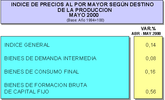 El Indice de Precios al por Mayor a Nivel Nacional (IPM) de mayo fue 151,66, con este nivel del índice la variación mensual registrada fue 0,14%, la acumulada en lo que va del año 1,42% y la anual 4,17%. En este mes, los productos de mayor incidencia en la determinación del Indice General de Precios al por Mayor fueron los manufacturados nacionales y los provenientes de la pesca marítima, registrando los primeros una variación mensual de 0,43% y los últimos de 1,84%. En otro sentido influyeron los agropecuarios nacionales que continuaron con una tendencia a la baja y registraron una variación mensual de -1,71%. Los productos importados tuvieron un incremento mensual de 0,23%, los que más subieron fueron los agropecuarios con 0,92%, y en menor medida los manufacturados cuya variación fue 0,19%. ![]() Visto el IPM según el destino de la producción en el mes de mayo del 2000, los bienes de demanda intermedia fueron los que registraron la menor alza con 0,08%, seguidos por los bienes de consumo final con 0,16%. Asimismo, los bienes de Formación Bruta de Capital Fijo presentaron un alza de precios promedio de 0,56%. El Indice de Demanda Intermedia resultó influenciado por la variación de los productos agropecuarios de origen importado que fue 1,13%. Los Bienes de Consumo Final (0,16%) tanto en la parte nacional como importada tuvieron una variación de 0,16% y las variaciones más importantes se dieron en los productos pesqueros y manufacturados nacionales. El promedio de los Bienes de Capital (0,56%) se vio influenciado fundamentalmente por la variación del precio del dólar que determinó el alza de los productos nacionales en 0,24% y de los bienes importados en 0,56%.