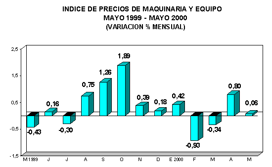 El Indice de Precios Promedio Mensual de Maquinaria y Equipo (IPME), para el mes de mayo fue 158,66. Registró una variación promedio mensual de 0,06%, al compararlo con su similar del mes anterior. La variación acumulada fue 0,0%, y la variación anual (junio 1999 - mayo del 2000) alcanzó el 4,35%. Según el Origen de los bienes, la Maquinaria y Equipo Nacional se contrajo en -0,16%, incidió en este grupo la variación de los bienes destinados a la Industria con -0,94%. Atenuaron este resultado los correspondientes a Otra Maquinaria y Equipo con 1,69%, Agricultura con 0,55% y Transporte con 0,22%. La Maquinaria y Equipo de Origen Importado registró en promedio un alza de 0,23%. La Maquinaria y Equipo destinado a la Agricultura registró una mayor variación en sus precios con 0,39%, seguido por los bienes destinados a la Industria y Transporte con 0,25% y 0,20%, respectivamente. En ambos casos, el reajuste de precios y las variaciones del tipo de cambio (dólar) determinaron estos resultados. | |||||