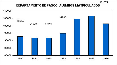 En el departamento de Pasco, los alumnos matriculados en las diferentes modalidades del sistema educativo alcanzan en el año 1996 a 101374, cifra que representa el 1,3% del total de alumnos matriculados a nivel nacional.