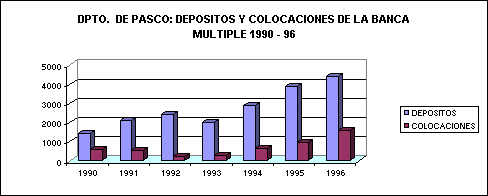 Los depósitos de la banca múltiple en el departamento de Pasco, al 31 de mayo de 1996 registraron 4 millones 426 mil nuevos soles constantes de 1990 representando el 0.12% del total nacional, en el año 1990 esta cifra alcanzó el 0.2%.