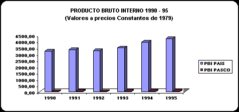 En el año 1995 el PBI del departamento de Pasco representó el 1,4% del PBI Nacional alcanzado en el periódo 1990-1995 una tasa de crecimiento promedio anual de 4,5% inferior al promedio nacional que fue de 5,5%.