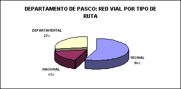 La longitud de la red vial del departamento de Pasco alcanza 2103,03 Kms. Equivalente al 2.9% del total nacional. El 55.9% de la red vial esta constituida por la red vecinal, el 17.4% por la vía nacional y el 26.6% por la vía departamental.
