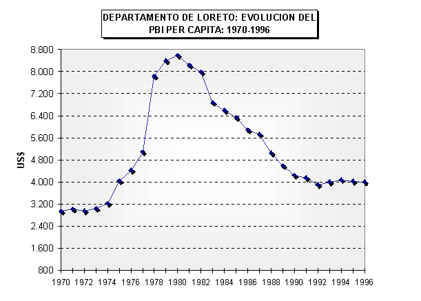 En el total nacional se requiere expandir el crecimiento del PBI en 5.30% cada año en los próximos cinco años, pero en los casos del dominio de selva (departamentos de Ucayali, Madre de Dios, San Martín y Loreto) esa tasa de crecimiento debe ubicarse entre 6 y 8 % anual. Igualmente altas deben ser las tasas medias anuales de crecimiento en departamentos como Tumbes (6.69%), Lima (6.09%), Lambayeque (5.87%), Arequipa (5.63%) y La Libertad (5.26%). En tanto que en el dominio serrano esas tasas globales de crecimiento requeridas fluctúan entre 4% y 5% por año. Es decir, realmente se requiere de expansiones, en el PBI altas y sostenidas en el tiempo para que el indicador per-cápita mejore. 5.2 Los Componentes de una Política ¿Porqué vías o con qué políticas conseguir esas tasas requeridas de crecimiento?. Esta es la interrogante a resolver. Una alternativa indudable es la inversión productiva de fuerte impacto en las economías regionales. Tal como se muestra en los gráficos siguientes, la explotación petrolera en Loreto, posibilitó que entre 1976 y 1980 el PBI se expandiera a una media anual de 21.36%; en el caso de Moquegua la fundición de cobre de Ilo permitió, en el mismo período, un crecimiento anual de 33.90%. Por ello, en el futuro inmediato, proyectos como el de Camisea o el de Antamina hacen albergar una certera esperanza de mejora en las economías departamentales de Cusco y de Ancash respectivamente. GRAFICO N° 5.1
