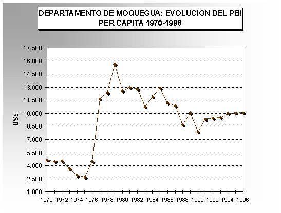 Asimismo, son notorias también las diferentes condiciones de ingreso del habitante rural con el promedio del propio departamento así incluso en una zona tradicionalmente pobre como el departamento de Puno el indicador rural es casi tres veces menor que el promedio general. En el tiempo, los cambios que experimentan los niveles de vida son también grandes. A nivel internacional los ingresos per-cápita en Estados Unidos han crecido históricamente alrededor de 2% por año y a esta tasa el ingreso medio de los hogares se duplica cada 35 años; en el Japón el ingreso medio se ha duplicado en los últimos 20 años y en Corea del Sur el ingreso de 1990 era el doble que en 1980. Entre 1970 y 1995, el PBI peruano ha crecido a una tasa de 2.10% anual , sin embargo la población lo ha hecho al 2.39% por año. Esto significa que el habitante promedio del Perú en 1995 vivía en peores condiciones que en 1970 y la intensidad de estos cambios difiere según regiones tal como se muestra en el cuadro N° 4.2. De acuerdo a lo mostrado por el cuadro existen trece departamentos en los cuales el nivel de ingreso per-cápita desciende entre 1970 y 1995 como resultado de que el crecimiento del PBI es inferior al crecimiento de la población. Existen otros siete departamentos cuyo crecimiento efectivo es inferior a 1% por año; asimismo, se registran tres departamentos (Cajamarca, Loreto y Huancavelica) cuyo crecimiento es superior a 1% es decir duplicarían su renta per-cápita en 60 años (contados a partir de 1970) y un solo departamento (Moquegua) que crece al 3.21% promedio anual lo que significa que es el único departamento que entre 1970 y 1995 ha visto duplicar su ingreso promedio por habitante 16/.